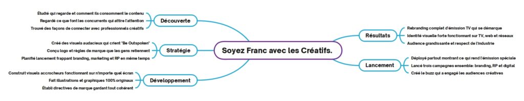 L’équipe de production télévisuelle nécessitait un développement complet d’identité de marque pour le lancement de leur nouvelle émission qui créerait un impact durable au-delà de la simple visibilité à l’antenne, établissant une présence de marque audacieuse avec des campagnes marketing dignes de buzz et des visuels accrocheurs optimisés pour tous les formats d’écran. Le défi principal impliquait de développer un message qui se connecte authentiquement avec les publics de professionnels créatifs tout en créant des systèmes d’identité visuelle qui se démarqueraient sur les marchés du divertissement concurrentiels et stimuleraient un engagement significatif sur plusieurs canaux.