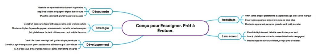 La mise en œuvre comprenait la création de plus de 15 modules d’apprentissage structurés conçus pour guider les utilisateurs de la curiosité initiale à la maîtrise des compétences à travers des formats de leçon propres, des quiz interactifs et des flux de travail progressifs étape par étape qui améliorent les taux de rétention et d’achèvement. L’exécution du lancement impliquait une planification de campagne complète avec des listes de contrôle de déploiement détaillées, des parcours d’intégration optimisés et des outils de marketing de contenu intégrés qui convertissent l’engagement des visiteurs en conversions de revenus. La plateforme a atteint 100% de propriété de marque blanche avec deux flux de revenus activés et une infrastructure évolutive soutenant une croissance continue. Le client fonctionne désormais avec une plateforme d’apprentissage professionnelle qui délivre des résultats éducatifs mesurables tout en générant un revenu durable grâce à des stratégies de monétisation diversifiées.