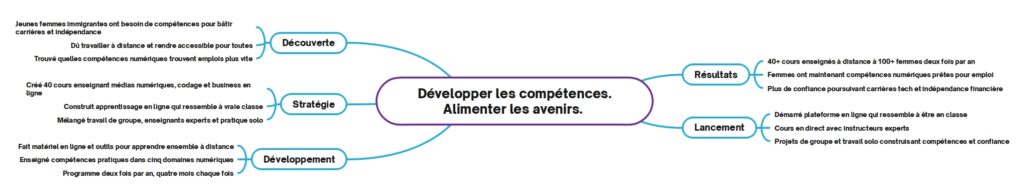 L’organisme à but non lucratif basé à Montréal nécessitait une programmation éducative numérique complète spécialement conçue pour autonomiser les jeunes femmes immigrantes grâce au développement de compétences qui permettrait l’indépendance économique et l’avancement professionnel. Le défi principal impliquait le lancement d’un cours numérique spécialisé couvrant le développement web, le marketing en ligne et les fondamentaux du commerce électronique via une prestation à distance deux fois par an sur des périodes de quatre mois, garantissant l’accessibilité indépendamment des barrières géographiques ou économiques.