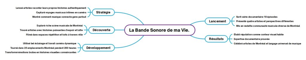 La production englobait 25 emplacements à travers Montréal avec 250 heures de tournage, utilisant un éclairage riche, un mouvement dynamique et des techniques de composition personnelles qui traduisaient les émotions brutes en narrations visuelles inoubliables. La mise en œuvre a abouti à une série documentaire de 18 épisodes mettant en lumière quatre artistes divers tout en fusionnant de multiples perspectives culturelles en un message cohérent sur le pouvoir de la musique de briser les barrières. Le projet a renforcé le positionnement de la marque en tant que producteur visionnaire et narrateur visuel, établissant une expertise dans la réalisation de documentaires et le développement de récits culturels. La série sert désormais de témoignage à la diversité artistique de Montréal et au langage universel de l’expression musicale.