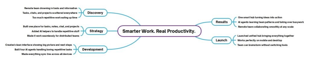 The implementation included deployment of four custom AI agents designed to handle repetitive tasks, suggest workflow improvements, and evolve with team behavior patterns, reducing manual overhead while accelerating forward motion. Technical execution encompassed live editing capabilities, synchronized updates across all devices, mobile accessibility, and structured brainstorming tools that eliminate tool-switching requirements. The project delivered a unified hub for tasks, notes, and communications with 100% mobile and desktop synchronization, enabling teams to work flexibly while maintaining productivity flow. The AI-enhanced workspace now operates as an intelligent command center that transforms ideas into actionable outcomes while supporting distributed team collaboration at scale.
