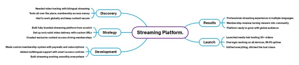 This internal project required developing a comprehensive media hub that exceeded basic video hosting capabilities, delivering a seamless, bilingual streaming experience with high-quality on-demand content, secure membership access, and global scalability. The core challenge involved creating a fully branded streaming platform that could transform disjointed tools into one cohesive system while establishing exclusive content access and sustainable membership growth strategies. Our strategic approach centered on building rock-solid infrastructure using CDN technology with custom video URLs that ensure smooth, secure, and scalable streaming performance across all devices and geographic locations.