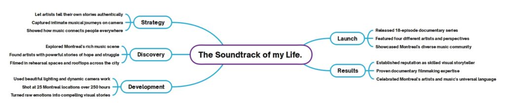 The production encompassed 25 locations across Montreal with 250 hours of filming, utilizing rich lighting, dynamic motion, and personal composition techniques that translated raw emotions into unforgettable visual narratives. The implementation resulted in an 18-episode documentary series spotlighting four diverse artists while fusing multiple cultural perspectives into one cohesive message about music’s barrier-breaking power. The project strengthened brand positioning as a visionary producer and visual storyteller, establishing expertise in documentary filmmaking and cultural narrative development. The series now serves as a testament to Montreal’s artistic diversity and the universal language of musical expression.