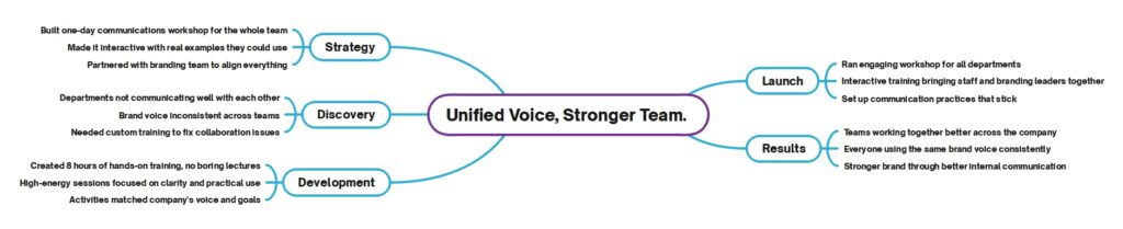 The implementation involved close collaboration with their branding department to ensure every workshop activity aligned with established voice, tone, and long-term strategic goals. We delivered eight hours of dynamic, hands-on training that eliminated traditional lecture formats in favor of energy-driven, clarity-focused sessions with immediate practical relevance. The workshop successfully achieved enhanced team alignment that translated into stronger company-wide collaboration, elevated the iconic brand through improved internal communication practices, and established sustainable frameworks for ongoing communication excellence. BeaverTails HQ now operates with unified voice consistency across all departments and measurably improved cross-functional collaboration capabilities.